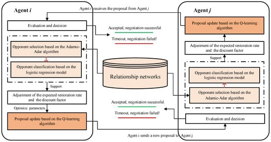 During the preparation phase, an initial opponent profile is constructed by using historical interaction data and social relationship networks, quantifying both relationship strength and type. In the interaction phase, learning parameters are dynamically adjusted based on the opponent model created in the previous phase. Simultaneously, the opponent’s strategic characteristics are updated in real time by analyzing their reactions and concession behaviors in response to proposals. This continuous adjustment allows for the optimization of the agent’s Q-learning strategy, ultimately updating personalized proposals. The proposed model framework is depicted in Figure 1.