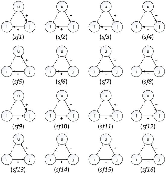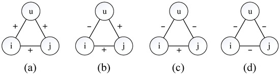 According to the principle of local structural balance, given a set of nodes , , and , with and being the source and target nodes, respectively, each triad involves the links , , and . Assuming each link (disregarding its direction) has its own label, a triad can be considered balanced if the number of negative-labeled links is even. For example, Figure 2a,c depict examples of balanced triads, while Figure 2b,d illustrates examples of unbalanced triads.