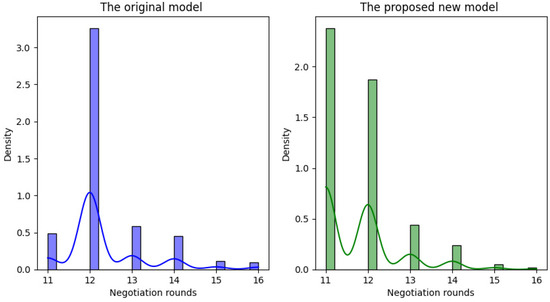 - Regarding negotiation rounds, the original model (OM) had 12.350 negotiation rounds; with the addition of only Component 1, negotiation rounds significantly decreased to 10.575; with the addition of only Component 2, the number of negotiating rounds slightly decreased to 11.206; and the final proposed model (PM), which incorporates both Component 1 and Component 2, had a negotiation round of 11.758. This observation suggests that the combination of the two components may increase the complexity of the model, leading to a further increase in negotiation rounds. However, the PM still showed an improvement in negotiation rounds compared to the OM.
