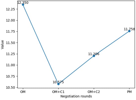 Given that the parameter of expectation restoration rate influences the proposal value [17,42], the method proposed by Wu et al. [17] is referred to as the original model (OM) in this study. This baseline model serves as the initial negotiation framework before any optimization, with its performance representing the initial level of negotiation before any enhancements or adjustments. According to the original model [17], the proposal value update function of the negotiating agent is presented in Equation (8).