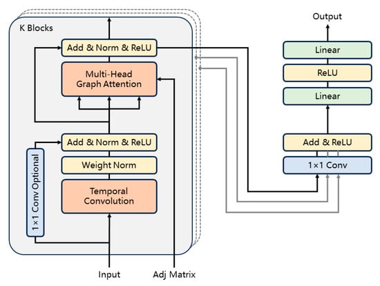 It is noteworthy that the weight normalization applied by the temporal convolutional layer pertains specifically to the network’s weight parameters rather than the data themselves, in order to mitigate gradient fluctuations during training. The dilation coefficient of the temporal convolutional layer is doubled with each passage through a spatio-temporal block from the bottom to the top, enabling the lower layers to address short-term trends while the upper layers manage long-term trends. Concurrently, the graph attention layer aggregates the features of various neighboring nodes based on attention scores. Ultimately, the output section is composed of two fully connected layers.