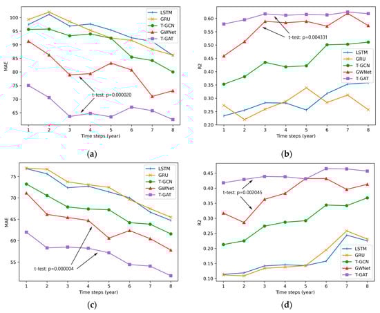 2 value of T-GAT remains more stable across varying time steps compared with other models, indicating that T-GAT demonstrates superior robustness in data interpretation. Furthermore, the results of the