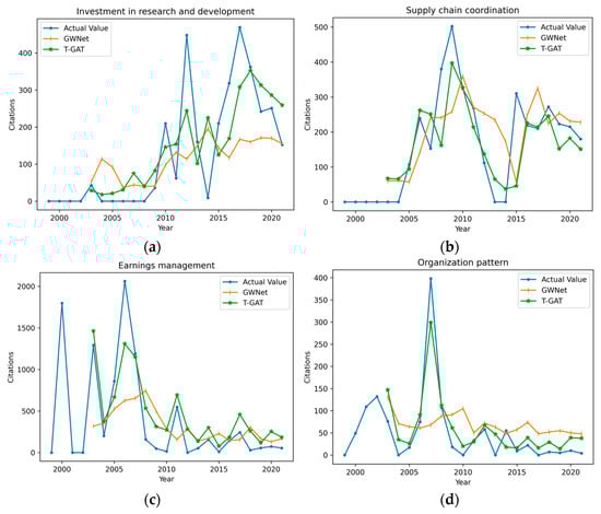 Figure 5. The observation time step is set to 4 years, while the prediction time step is 1 year. The results indicate that the prediction curve of Graph WaveNet is relatively smooth, whereas T-GAT more accurately captures the trends in research topic changes. This discrepancy may be attributed to the over-smoothing phenomenon associated with the GCN utilized in Graph WaveNet, which tends to homogenize node features as the number of network layers increases. In contrast, T-GAT’s ability to capture node correlations is grounded in an attention mechanism that dynamically adjusts the weights of different neighboring nodes during each neighborhood aggregation, thereby mitigating the risk of over-smoothing.