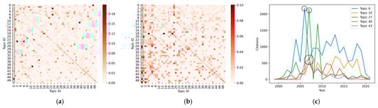 Figure 6 illustrates the capacity of the graph attention mechanism to extract correlation features of research topics. Specifically, panel (a) presents the standardized adjacency matrix of the top 50 research topics, panel (b) displays the attention matrix of these topics as learned by the model, and panel (c) provides a comparative analysis of the actual trends across multiple topics. It is noteworthy that the zeroth column of the attention matrix indicates that topic 0 possesses a higher weight relative to topics 10, 27, 40, 43, and others. This observation is corroborated in panel (c), where the citation count for topic 0 reached its zenith in 2006, while the corresponding topics 10, 27, 40, and 43 also experienced peak citation counts in the subsequent year. This suggests that the prominence of topic 0 exerts a significant influence on the aforementioned topics. Conversely, the adjacency matrix fails to capture this correlation, thereby highlighting the importance of dynamically adjusting the weights of neighboring nodes through the attention mechanism to more accurately extract the correlation features among research topics.
