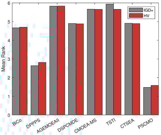 Average ranking of 8 algorithms in the Friedman test for IGD+ and HV across all test functions.