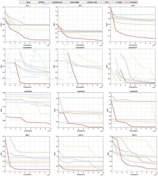 Figure 3 illustrates the IGD+ convergence curves for PSCMO and six comparative algorithms after 100,000 evaluations, with only the IGD+ values of the feasible solutions plotted. The results indicate that the PSCMO algorithm excels in its convergence speed, especially in problems with narrow feasible regions like DAS-CMOP4, LIR-CMOP2, and MW13. This is due to the ability of both the subpopulations and unconstrained populations in PSCMO to approximate the CPF from both the infeasible and feasible regions of the search space. PSCMO also performs well in problems with large feasible domains, such as LIR-CMOP5 and LIR-CMOP6, demonstrating its capability to efficiently handle such cases. Additionally, PSCMO excels in problems where the CPF is composed of separate segments, such as CF3, DAS-CMOP5, and DAS-CMOP7. The complementarity and collaboration between subpopulations and unconstrained populations allow PSCMO to quickly find a well-distributed set of solutions across the entire CPF, leading to rapid convergence. Compared to the other seven algorithms, PSCMO shows significantly faster convergence as the evaluations increase. While PSCMO initially shows higher IGD+ values on the test functions CF4, CF6, MW2, and MW14, it rapidly converges to the Pareto front after around 30,000 evaluations, highlighting its strong ability to escape local optima. Even though DPPPS achieves faster convergence compared to that of the other algorithms, it still falls short of PSCMO’s performance. Overall, PSCMO outperforms the other algorithms in terms of both its convergence speed and final convergence quality, demonstrating its superiority in solving constrained multi-objective optimization problems.