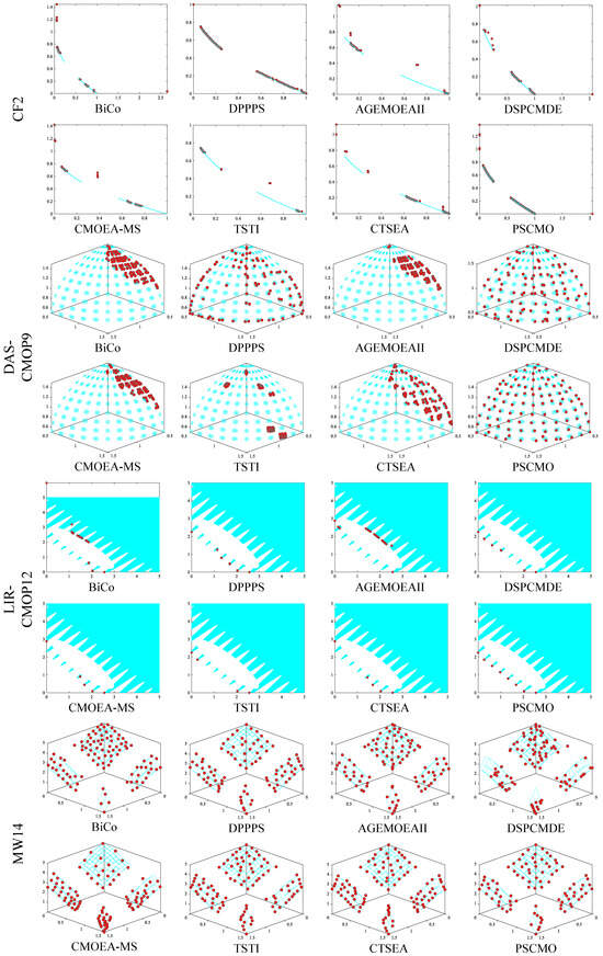 The DAS-CMOP problems are characterized by Pareto fronts composed of disjoint line segments obscured by extensive infeasible regions, with some feasible regions situated far from the unconstrained Pareto frontier. As shown in Table 2, PSCMO demonstrates a superior performance, achieving the optimal IGD+ for DAS-CMOP1 to DAS-CMOP4, DAS-CMOP6, DAS-CMOP8, and DAS-CMOP9. However, CTSEA obtains the best IGD+ only for DAS-CMOP5. Similarly, Table 3 highlights PSCMO’s achievement of the best HV among the compared algorithms for DAS-CMOP2 to DAS-CMOP4, DAS-CMOP6, and DAS-CMOP9. The other algorithms, including AGEMOEAII, DSPCMDE, TSTI, and CTSEA, achieve the best HV for DAS-CMOP7, DAS-CMOP1, DAS-CMOP8, and DAS-CMOP5, respectively. Although CTSEA performs well for DAS-CMOP5, achieving both the best IGD+ and HV, its performance is less competitive for the other test functions, ranking as low as sixth in terms of the IGD+ and HV values for DAS-CMOP9. This suggests that CTSEA is effective in specific problems but lacks general applicability across a broader range of DAS-CMOP functions. Regarding feasible solution rates, algorithms such as BiCo, AGEMOEAII, and DSPCMDE fail to consistently obtain feasible solutions for all test problems in this set. This limitation may stem from the challenges associated with acquiring feasible solutions in multiple swarm algorithm frameworks. In summary, PSCMO stands out among the compared algorithms, consistently demonstrating an excellent performance in its convergence, diversity, and feasibility across the DAS-CMOP benchmark functions.