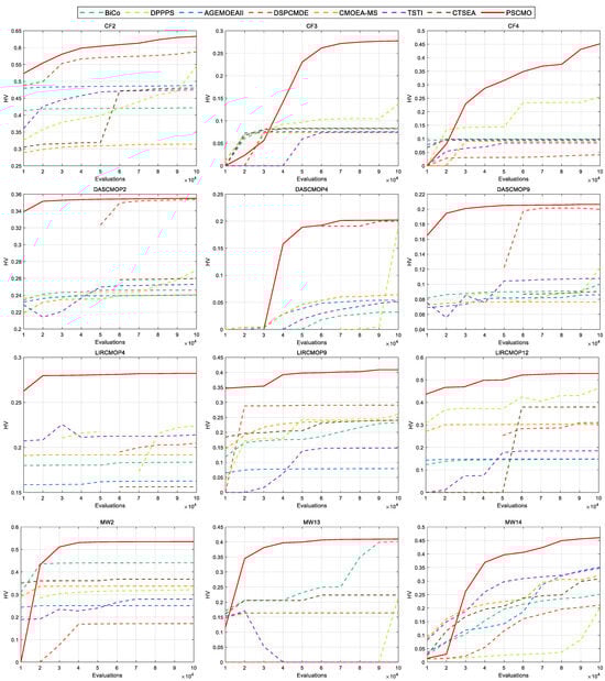 Figure 4 displays the population distribution of PSCMO and seven comparative algorithms across four different test functions, with each algorithm using a population of 100 individuals and a maximum evaluation count of 100,000. The results show that PSCMO consistently achieves the best distribution across these functions, outperforming the other algorithms in both convergence and diversity. In particular, AGEMOEAII, CMOEA-MS, TSTI, and CTSEA perform poorly in terms of convergence and diversity. In the CF2 test function, none of these algorithms can reach the Pareto front region, and in DAS-CMOP9, they fail to reach smaller feasible domains. This suggests that these algorithms struggle to relax the constraints sufficiently, preventing them from escaping local optima when they are encountered. The same issue is observed with BiCo. For CMOPs, it is crucial to appropriately relax the constraints to allow the algorithm to explore the entire feasible domain and reach all feasible regions, especially smaller ones. On the other hand, DPPPS and DSPCMDE demonstrate good convergence and diversity, performing similarly to PSCMO in CF2, LIR-CMOP12, and MW14. However, as seen in DAS-CMOP9, the diversity of DPPPS and DSPCMDE significantly lags behind that of PSCMO. This may be due to their susceptibility to infeasible regions, which hinders their ability to maintain a well-distributed population across the solution space. Figure 5 shows the convergence curve for HV, representing the evolution of the diversity indicators throughout the population’s evolution process. The graph reveals that PSCMO does not perform optimally during the first 30,000 iterations, a pattern also observed in the IGD+ curve. However, PSCMO consistently demonstrates a rapid improvement in the population diversity after this initial phase, as seen in cases such as CF3, CF4, DAS-CMOP4, and MW14. From CF3 and CF4, it is evident that the other comparative algorithms tend to become trapped in local optima, preventing them from escaping and causing their HV values to plateau before reaching an optimal solution. In contrast, as seen for CF2, DAS-CMOP4, MW2, MW13, and MW14, PSCMO exhibits a relatively faster increase in diversity. This is due to PSCMO’s ability to switch between different CHTs based on varying population states, which enhances both the population diversity and the algorithm’s capacity to explore global optima. Overall, PSCMO outperforms the other algorithms in terms of the diversity and the convergence speed for HV.