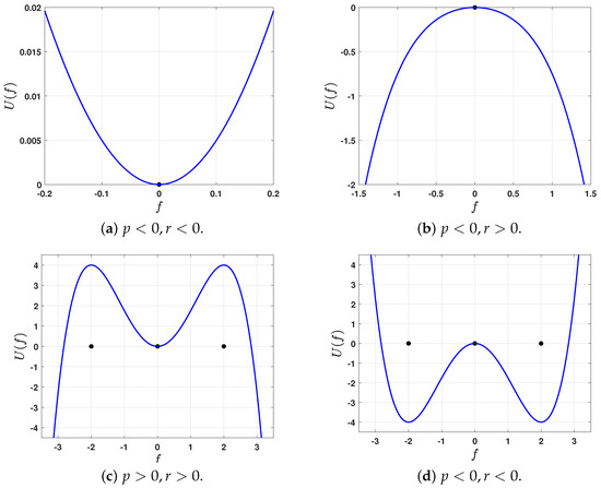 The equilibrium points of the system (18) correspond to the critical points of the potential function (18). Consequently, these points are given by , where is a solution of . If , the system (18) has a single equilibrium point, . However, if , it has, in addition to O, two additional equilibrium points, . The nature of these points—whether they are a maximum (saddle point) or a minimum (center point) of the potential function (18)—is determined as in [37]. We have