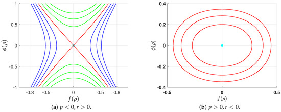 - If (), the unique equilibrium point O is a maximum of the potential function (18) and, therefore, a saddle point. Conversely, if (), it is a minimum of the potential function (18) and thus a center. See Figure 1a,b for a visualization, and Figure 2 for the corresponding phase portrait.