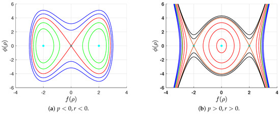 - When (), O is a maximum of the potential function (18) and is therefore a saddle point, while are minima and thus serve as center points. Conversely, when (), O becomes a minimum of the potential function (18), making it a center, whereas are maxima and therefore saddle points. See Figure 1c,d for visualization. The corresponding phase portraits are shown in Figure 3.