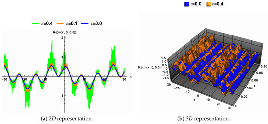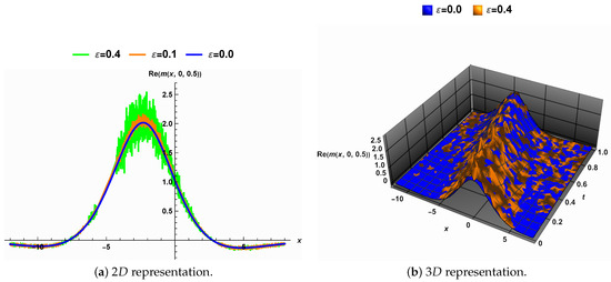 Figure 7 depicts the noise strength impact on the solution (29). In Figure 7a, the solution is shown to resemble a solitary solution in the deterministic case, highlighted in blue. To increase the noise strength, the solution’s amplitude grows, while its width remains nearly unchanged. Figure 7b shows that the surface corresponding to the solution (29) becomes rougher with increasing noise strength.