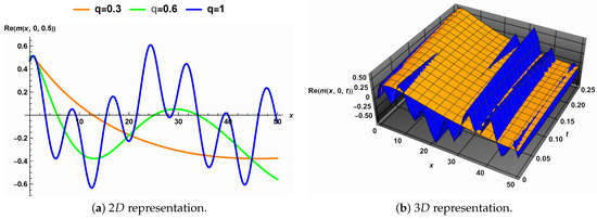 The fractional derivative order impact on the solution (29) is demonstrated in Figure 8. Figure 8a shows that the solution is symmetric when the derivative order is an integer, i.e., , and its symmetry is lost as the fractional order drops from 1. The surface characterized by the solution (29) remains smooth for all values of q, as shown by Figure 8b.