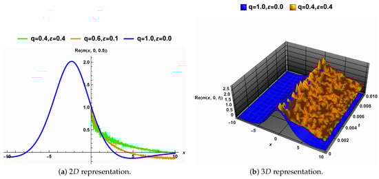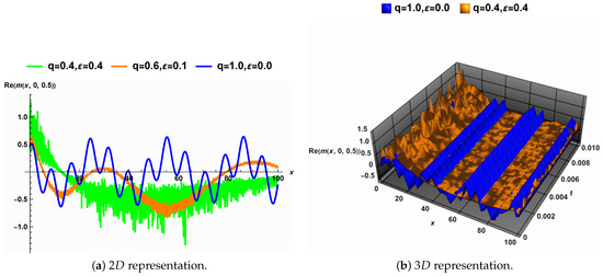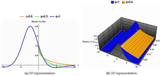 Figure 5 explains the fractional-order derivatives’ impact on the solution in the deterministic case, i.e., when . Figure 5a illustrates how the solution width greatly rises as the fractional order q drops from one. The surface described by the solution (24) is smooth for all fractional order values q, as Figure 5b demonstrates.
