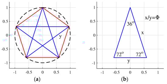 There are many geometric figures that can be described by proportions related to the number . As an example, the well-known isosceles triangle, with angles of , , and has been considered as the golden triangle [4]. Fifteen similar triangles are found in a figure composed of a circle with an inscribed pentagon and a five-pointed star, or pentagram, which are shown in Figure 2a. One of these golden triangles is shown in part (b). In this triangle, the ratio of the larger side to the smaller side is the golden number It is also known that, if we inscribe a regular decagon on the unit circle in Figure 2a, the side of the decagon will have a length of [5].