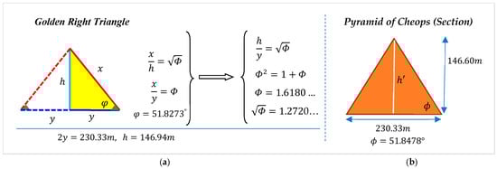 The right triangle, with its properties shown in Figure 3a, is another example of the golden triangle. Such a triangle can be seen in the construction of the ancient Cheops pyramid [2]. As shown in the figure, the ratio of the hypotenuse, to the biggest side, of the triangle is the square root of the golden ratio, . The ratio of the hypotenuse to the smallest side, of the triangle is . The vertical cross-section of the pyramid of Cheops is illustrated in part (b). The length of the base of the triangle is 230.33 m and the height, is 146.60 m (according to the original data). The slope of this equilateral triangle is . It should be noted that the height of the golden right triangle, whose base is exactly 230.33 m, must be 146.94 m, which is very close to 146.60 m.