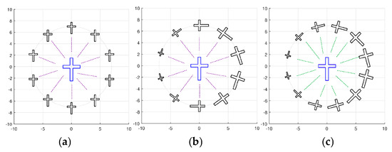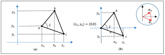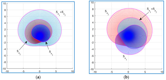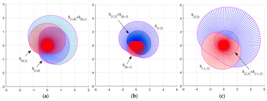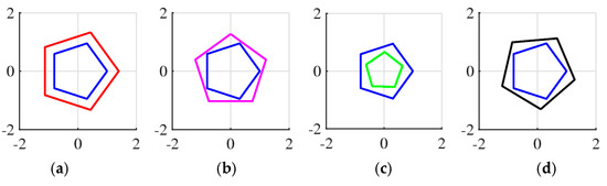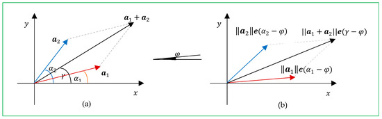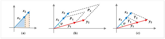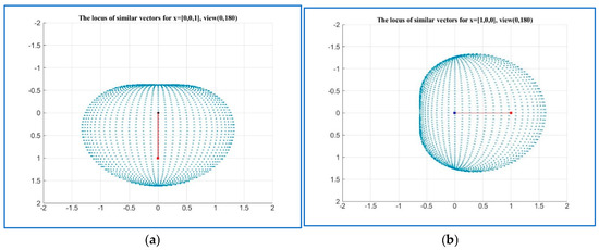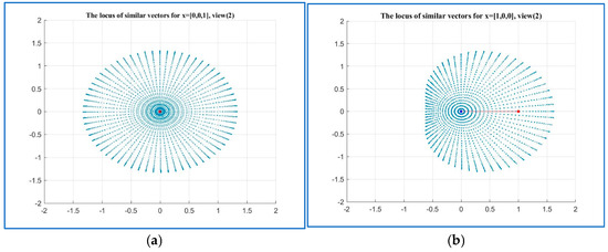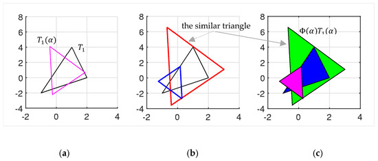 These complex coefficients of “similarity” are equal in absolute value to 1; that is, they do not affect the length, but only the rotation by . We can say that the first equation in Equation (7) defines similarity by length and the second equation defines similarity by rotation.