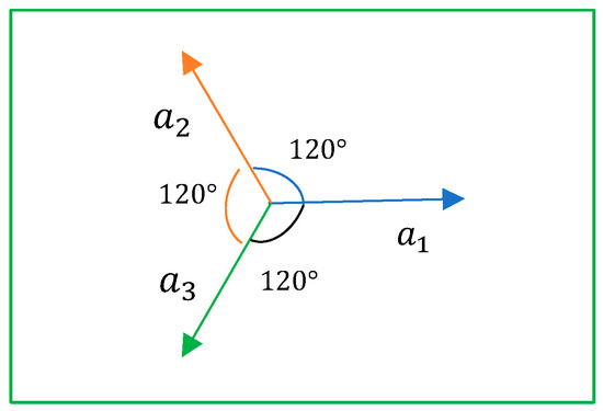 D. Case (the vectors of the golden pair have the same length): Equation (6) is and the angles . Two pairs of vectors with the angles and 120 (in degrees) between them form the golden pairs when their lengths are equal. Figure 6 shows three vectors, and , with the same length. Each of these vectors are in the golden ratio with two others.