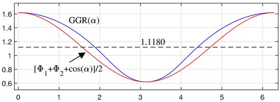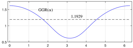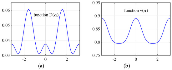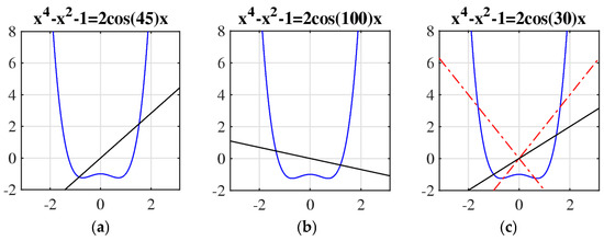 with the initial condition = 1.61803398… For each angle α, the quartic polynomial in this equation has four roots, and two of them are complex, therefore being a complex conjugate. We are looking for a positive solution of this equation, which should be only one. Equation (9) can be written as The parabola crosses the straight line with the slope at two points. As an illustration, Figure 7 shows the graph of the polynomial together with the line , when in part (a) and in part (b).