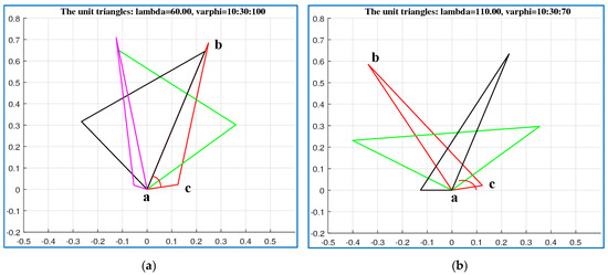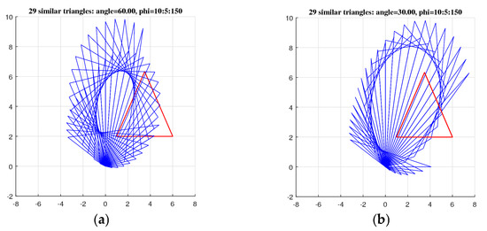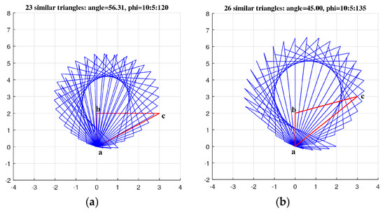 (Triangle). Let us consider the following three points on the space: , and These points together compose one triangle, which we denote by . We need to draw the triangles which are in the golden ratio with the triangle rotated by . Figure 35 shows the original triangle in part (a) (in black color) together with the rotated triangle (in magenta). The solutions of the golden equation for this angle are