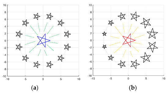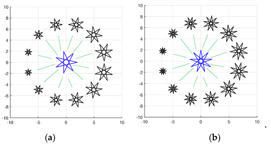 Figure 42 in part (a) and 12 golden pair stars placed around a circle. These golden pairs were calculated for a star half the size, . Figure 42a shows a similar picture for the nine-pointed star, . The golden pairs of these two stars were calculated for angles of 15,,,,145, …,and 335 and are shown in parts (b) of these figures.
