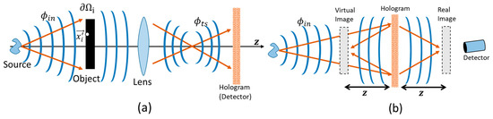 Graphic representation of the two steps involved in the performance of Gabor’s on-line hologram: (a) recording, and (b) reconstruction. (a) A source emits a wavefront, ϕin, which propagates and interacts with an object (e.g., a thin slice). The diffracted (or scattered) field, ϕts, passes through a convergent lens, resulting in a convergent beam that subsequently strikes the hologram plate (or a suitable detector). (b) During reconstruction, a similar source illuminates the hologram with the ϕin field. This interaction produces two twin images: a virtual image (on the left) and a real image (on the right), symmetrically positioned at a distance z from the hologram. A detector can capture these forming images. Point x’i∂Ωi.