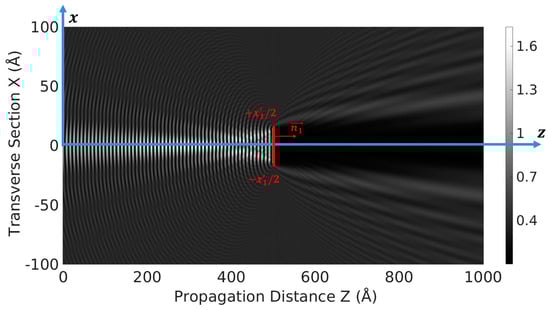 In Figure 7, we present the simulation results for the on-line Gabor hologram of an object: a vertically oriented 50 Å plate located at z = 500 Å and centered in the coordinate system. At the origin of coordinates (x = 0, z = 0), we place an ideal line source of a thermal neutron beam with very small dimensions (i.e., 1 Å), emitting particular non-planar waves in all directions, defined as , where is the Hankel function of the first kind and zero order. It is worth noting that in a hypothetical 3D case, the corresponding neutron beam would approximate spherical waves, expressed as . The digital hologram is positioned at z = 500 Å, i.e., 200 Å away from the object.