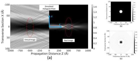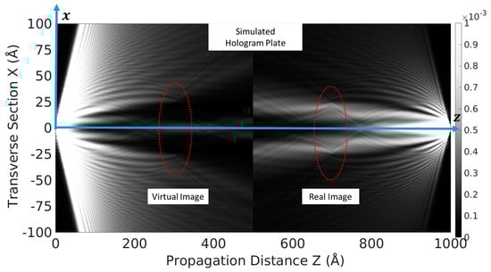 Following the same operational procedure as in the preceding case, and considering the holographic recording and reading process illustrated in Figure 2, we simulated an on-line Gabor hologram with an holographic plate as the object, similar to the one shown in Figure 3. In this simulation, the holographic plate is illuminated by a plane thermal neutron wavefront. The reconstruction wavefront is identical to the one used during the recording process. For this scenario, we assumed a vertical dimension of the plate, = 30 Å, positioned at z = 500 Å, with λdb = 1.8 Å.