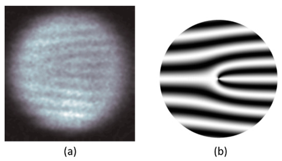 To address this gap, we have compared our simulated results with available experimental data. Specifically, we reference the experimental work conducted by Sarenac et al. in 2016 [16], selecting one of their recorded holograms, as shown in Figure 5a. The object under study, Figure 5b, is a spiral-phase plate (SPP) with a topological charge of q = 2, a structure known to facilitate spin–orbital angular momentum exchange in a monochromatic light beam [23].