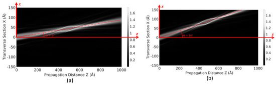 As a simple demonstration of the algorithm operative method, we show how a hologram can be located in various spatial points depending on the angle formed by the reconstruction wave (the plane wavefront in the present case). In the case of inclined beam reconstruction, the wavefront is denoted as , θ: angle of incidence with respect to the z-direction and where is the wavevector. This is then an example for off-axis procedure (not essentially Gabor’s method). The computation results with this condition is displayed in Figure 6. The effect of the inclined reference beam is that the angle θ alters the propagation direction of the reconstructed wavefronts. The image is displaced due to the oblique incidence, and the vertical position of the object plate in the hologram determines the reconstructed geometry. This method is widely applied in neutron holography to analyze vertically oriented objects. It is essential for imaging applications where oblique wavefronts enhance resolution or separate overlapping features. Eventually, the detector might be located at the corresponding angle to detect the scattered field.