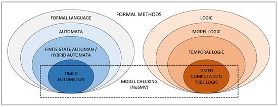- Cimatti, A.; Clarke, E.; Giunchiglia, E. NuSMV 2: An OpenSource Tool for Symbolic Model Checking. In Proceedings of the Computer Aided Verification: 14th International Conference, CAV 2002, Copenhagen, Denmark, 27–31 July 2002. [Google Scholar]