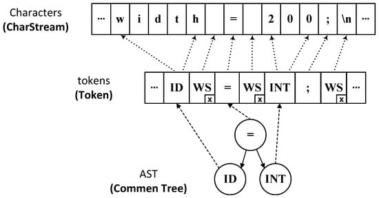 When we perform analysis operations using ANTLR, we use lexical and syntactic analyzers to transform and reconstruct input character sequences into statements under new language rules. The function of a lexical analyzer is to read and analyze the morphology of structured text or binary files and classify vocabulary symbols. The analyzed character sequence will be decomposed and stored as a single token. The syntax analyzer detects the correctness of these character sequences and establishes an analysis tree (AST), in which the leaf nodes serve as containers for storing lexical symbols in the stream (these leaves can be traversed to complete the reconstruction of new language statements). Figure 4 shows the decomposition of a language by the syntax tree AST.