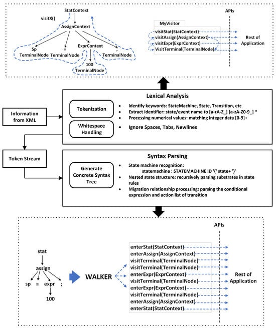 ANTLR is a syntax analyzer generation tool that reads, processes, executes, and translates structured texts or programming languages [19]. The main parsing processes of ANTLR are lexical analysis, syntactic analysis, and AST (abstract grammar tree) analysis. Based on custom syntax files, through the above steps, the program can recognize and process text that conforms to syntax specifications and convert the original language text into the target language text according to conversion rules [20].