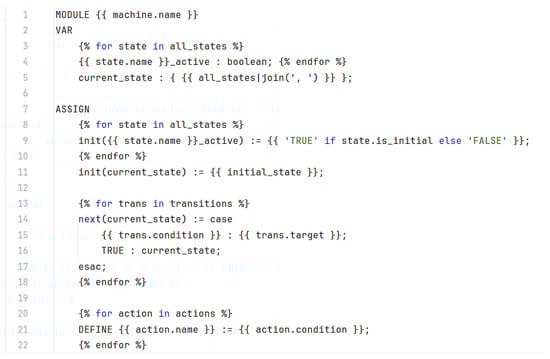 . The program statement segments in state machine languages correspond to the basic operation forms in SMV. The statement types in state machine language include , , and , which are matched to the , , and in the basic operation form of SMV.