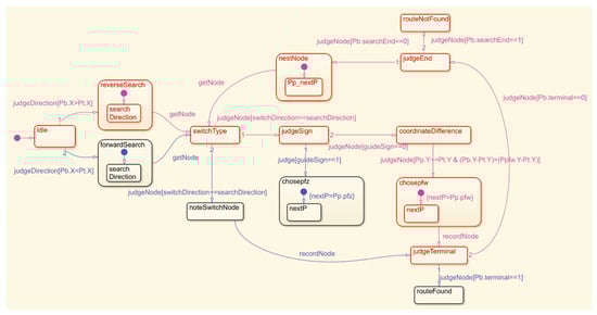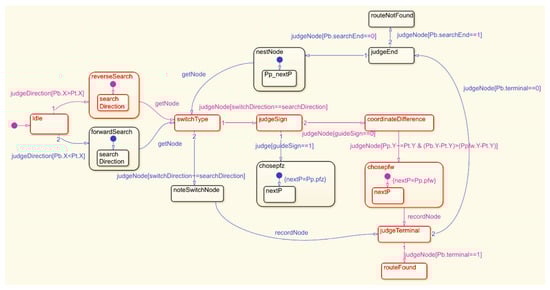The states, transitions, events, and activities related to objects are essential graphic elements in the Simulink/Stateflow state diagram: blocks, starting points, transitions, and connection nodes. Afterward, auxiliary program commands and function statements will be added to the diagram to complete the entire state transition process.
