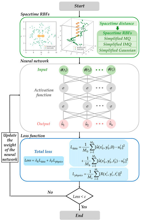 where R is the characteristic length. These three RBF types require only the boundary and source points for computation. The selection of specific RBF types, including the simplified MQ, IMQ, and Gaussian, is driven by their widespread use and effectiveness in meshless methods and deep learning applications, where they demonstrate strong numerical stability and robust approximation capabilities [45,46]. These functions were specifically chosen for the following reasons: The simplified MQ RBF is frequently employed in solving PDEs due to its exceptional approximation ability for smooth functions, making it particularly suitable for applications that require smooth solutions. The simplified IMQ RBF is preferred for high-dimensional problems, as it generally offers superior interpolation and extrapolation properties, making it well suited for complex or high-dimensional datasets. The simplified Gaussian RBF, known for its excellent locality and approximation properties, is ideal for handling noisy data or situations where the solution features localized characteristics.