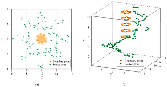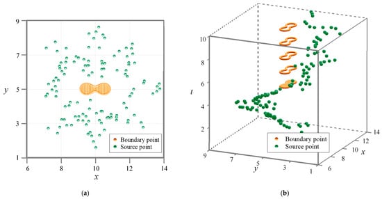 where and are the angle [-] and radius [L] of the source point, and is the dilation parameter [-]. This research employs Equations (21) and (22) to determine the spatial and temporal arrangement of source and boundary points, as demonstrated in Figure 2. The figure illustrates a non-uniform arrangement of source points located outside the boundary, while the time is segmented at consistent intervals. Using these equations, the boundary and source points are configured, and their coordinates are applied to one of the simplified RBF formulations to generate the input data required for training the proposed spacetime RBF-enhanced PINN framework.
