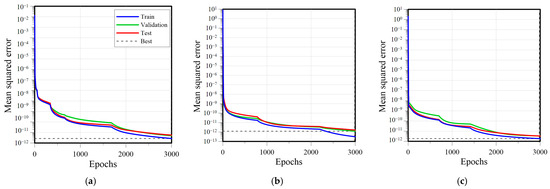 The data are divided into 70% for training and 30% for both testing and validation, with equal distribution. The parameters for training the proposed method are detailed as follows: the PINN architecture comprises two hidden layers, each containing five neurons, and utilizes the LM algorithm for optimization. The proposed model is trained over 104 epochs, with the performance goal initialized at 0 and stopping criteria set at 104. The learning rate is initialized, with corresponding stopping criteria and target values of 10−3, 10−13, and 1010. Similarly, the gradient is initialized, with stopping criteria and target values set at 10−2, 10−10, and 10−15. The overall training duration is 181 s, and the model convergence goal is achieved when the sum of squared errors performance function is less than 10−10. In this study, the PINN architecture integrates three variations of spacetime RBFs. The experiment focuses on examining how each of these RBFs influences the solution’s accuracy.