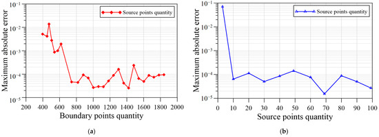 Figure 4a indicates that a boundary point quantity ranging from 1000 to 1200 achieves a MAE of approximately 10−4. Therefore, the subsequent analysis considers a boundary point quantity of 1002. This study further examines the effect of source points on numerical accuracy, with the number of source points ranging between 10 and 200. Figure 4b reveals that a source point quantity of approximately 69 achieves a MAE of 10−4. Based on the results of the evaluation of the impact of distribution point quantity on accuracy in this case, the optimal boundary point and source point quantities are determined to be 1002 and 69, respectively. Subsequent analyses use this parameter configuration for further calculations.