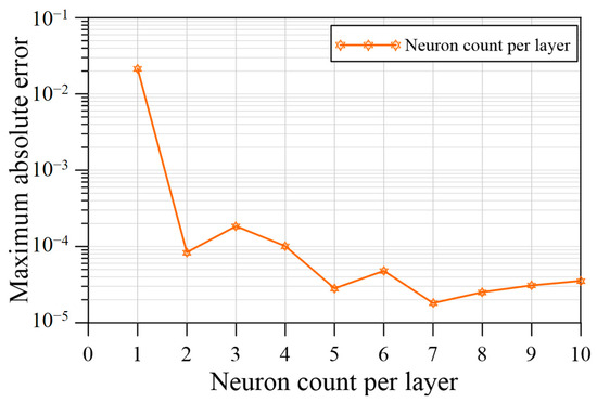 This study emphasizes hyperparameter tuning as a critical step to enhance the performance of the proposed method. It systematically investigates the effects of key parameters. By exploring these parameters, this study aims to determine the optimal hyperparameter configuration that not only maximizes accuracy but also improves convergence rates and computational efficiency for solving forward and inverse problems related to wave equations. This study initially investigates the impact of varying the number of neurons in a single hidden layer on the accuracy and overall performance of the analysis. To assess this effect, the study examines neural networks with the number of neurons ranging from 1 to 10. As illustrated in Figure 5, configurations with seven neurons consistently achieve an MAE of 10−4.