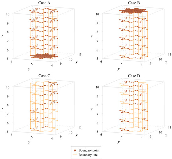 Table 4 lists a description of the four scenarios for problem types and considerations. This research investigates four unique scenarios, each distinguished by different boundary conditions. Case A involves both initial and complete boundary conditions, corresponding to a forward wave problem. In Case B, known boundary and final time conditions are provided, but initial conditions are unspecified, defining an inverse problem. In Case C, only partial boundary and initial data are available. In Case D, only a subset of boundary conditions is given, with no initial conditions defined. The arrangement of boundary points, according to these scenarios, is shown in Figure 7.