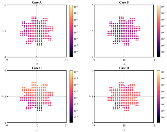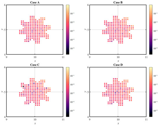 Figure 8 illustrates how the absolute error is distributed throughout the study area, excluding the influence of noise. According to the results, the MAE values for Case A, Case B, Case C, and Case D are 10−5, 10−5, 10−3, and 10−4, respectively. Figure 9 depicts the variation in absolute error across the study area while accounting for the impact of noise (noise level of 0.1). The results show that the MAE values for Case A, Case B, Case C, and Case D are 10−3, 10−3, 10−3, and 10−3, respectively. Furthermore, it is observed that the largest errors occur in regions where conditions are not specified. These findings indicate that the PINN developed in this study demonstrates robust accuracy in solving 2D inverse problems. The model consistently demonstrates dependable accuracy, even when boundary data are incomplete and noise is present.