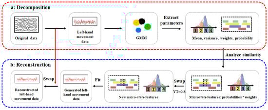 In this paper, each sampling point of the original multi-channel EEG data sample is divided into a linear combination of multiple Gaussian distributions, and the duration, frequency or coverage of each Gaussian submodel in the sample period constitutes the characteristics, covering the dynamic spatial–temporal information. The points are exchanged with the same characteristics in different samples at random so as to improve the data diversity while maintaining the overall characteristics of the sample. Then, new EEG data are generated through reconstruction. The principle is shown in Figure 1.