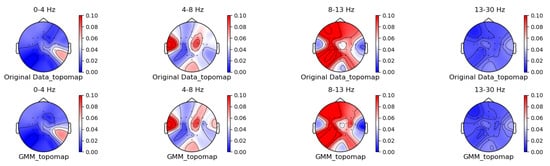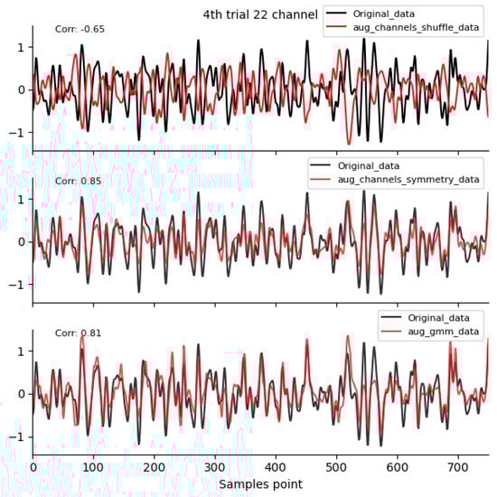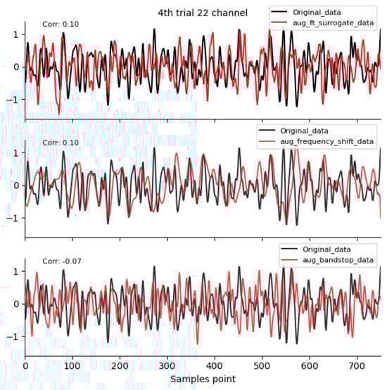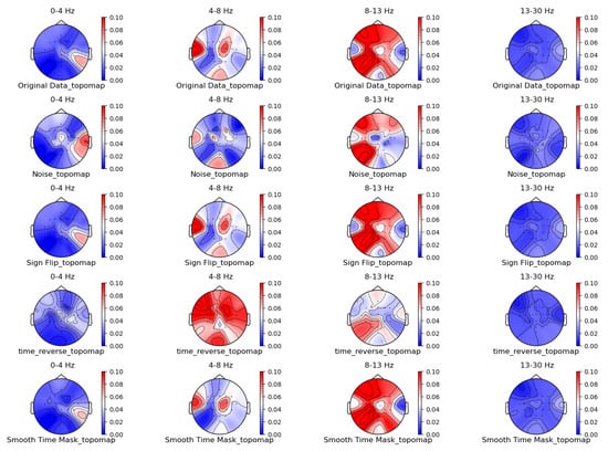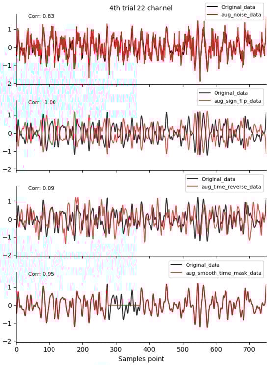 To compare the differences in spatiotemporal characteristics between traditional augmentation methods and the method proposed in this paper, we carefully selected four time-domain augmentation methods—noise addition [18,19], time reverse [19], time masking [19], and signal flip [19]. Meanwhile, three frequency-domain augmentation methods, namely Frequency shift [19], Fourier transform surrogate [13], and bandpass filter [19], as well as two spatial-domain augmentation methods, namely channel symmetry and channel shuffle [15,16], are chosen as the basis for the experiment. The augmented data used for comparison are generated by the augmentation functions in the Braindecode library [35], while the modeling of the Gaussian mixture model (GMM) is carried out using relevant classes in the sklearn.mixture module [36]. The parameter settings are as follows: the probability parameter is set to 0.5; the frequency-shifting parameter (sfreq_1) is set to 2.0; the bandpass filtering parameter (sfreq_2) is set to 100; the random seed parameter (random_state) is set to 21; the mask parameter (mask_len_samples) is set to 100; the noise parameter (std)is set to 0.16; and is set to 0.8, which is a user-defined value based on multiple experiments.