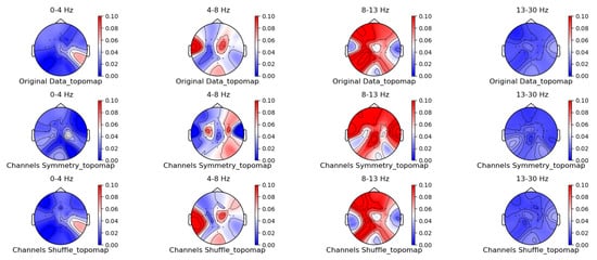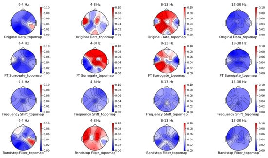 Figure 5, Figure 6, Figure 7 and Figure 8 shows the topographic brain maps of the first subject; the fourth trial; imagined left-hand movement; and the 0–4 Hz (Delta), 4–8 Hz (Theta), 8–13 Hz (Alpha), and 13–30 Hz (Beta) frequency bands, respectively, for data generated by the same ten EEG data augmentation methods.