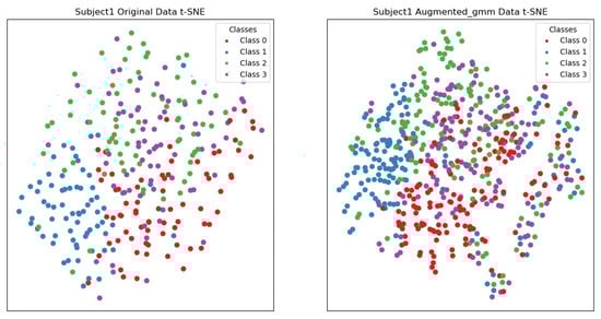t-SNE visualization of subject 1’s original data and the data augmented using the Gaussian mixture model (GMM). Red represents the data for left-hand motor imagery, blue represents the data for right-hand motor imagery, green represents the data for motor imagery of both feet, and purple represents the data for tongue motor imagery.