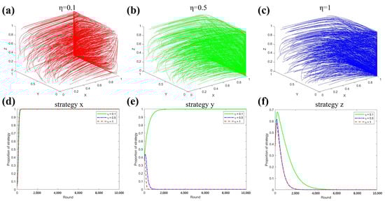 Figure 4 illustrates how the evolutionary paths (in Figure 4a–c) and strategy shares (in Figure 4d–f) of the population change when is , , and 1. Unlike , the three values of do not result in three evolutionary stable states for the population. When , is ESS for the population, while is ESS at both and . It is worth noting that the variation in only triggers a change in the demander’s choice of strategy y, while x and z are unaffected. It is possible that this phenomenon is caused by the small value of . So, we further verified the situation when and and found that this phenomenon persists. Combining Figure 3 and Figure 4 shows that although both and are risk compensation parameters, their effects are asymmetric, with leading to a full change in the population’s choices of x, y, and z, while leads to a change in only a single dimension of strategy y.