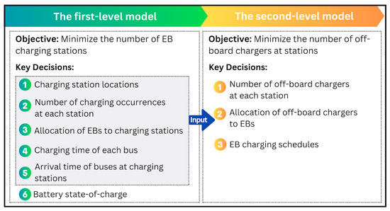 The framework of the proposed bi-level mathematical model is illustrated in Figure 1. The first-level model aims to determine the minimum number and optimal locations of DC fast-charging stations needed to support all buses in the transportation network. To achieve this, the model allocates EBs to charging stations while tracking their battery state-of-charge (SOC) at each stop. It also calculates the required charging times for each bus to ensure they reach their final destinations on schedule with sufficient battery levels.
