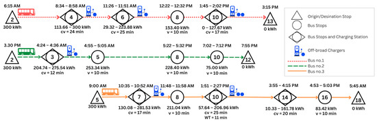 The results show that WT significantly influences the number of off-board chargers and the associated infrastructure cost. As shown in Table 9 and Figure 9, increasing WT allows buses to wait longer before charging, reducing the overall number of off-board chargers in the system. At WT = 10 min, the system requires eight off-board chargers, resulting in the highest infrastructure cost of 47.45 million THB. As WT increases, the number of chargers decreases. When WT = 60 min, only three chargers are needed, with one charger assigned to each of the three charging stations. In this scenario, the infrastructure cost drops to 21.99 million THB.
