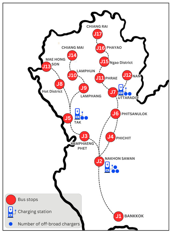 This research was motivated by Thailand’s commitment to achieving its net-zero emissions goals, reflecting the country’s focus on sustainable development. The adoption of EVs in Thailand, such as electric scooters, cars, and delivery trucks, has steadily increased. However, the transition to EBs has been limited or slow to develop. A significant barrier is the high infrastructure cost, particularly the investment required for DC fast-charging stations to support large vehicles. This challenge is compounded by budget constraints in developing countries, highlighting the need for careful planning and strategic resource allocation. While the environmental and social benefits of EBs are widely acknowledged, this study focuses on the economic aspect, particularly investment and infrastructure planning, which are crucial for large-scale EB adoption. Although economic feasibility is the primary concern, optimizing charging infrastructure also yields significant environmental benefits by lowering energy consumption, minimizing emissions, and reducing unnecessary detours for charging. Strategic infrastructure investment facilitates a smoother transition to fully electrified bus fleets, supporting long-term sustainability goals. Policymakers and planners must establish cost-effective charging infrastructure that meets the operational demands while considering real-world constraints.
